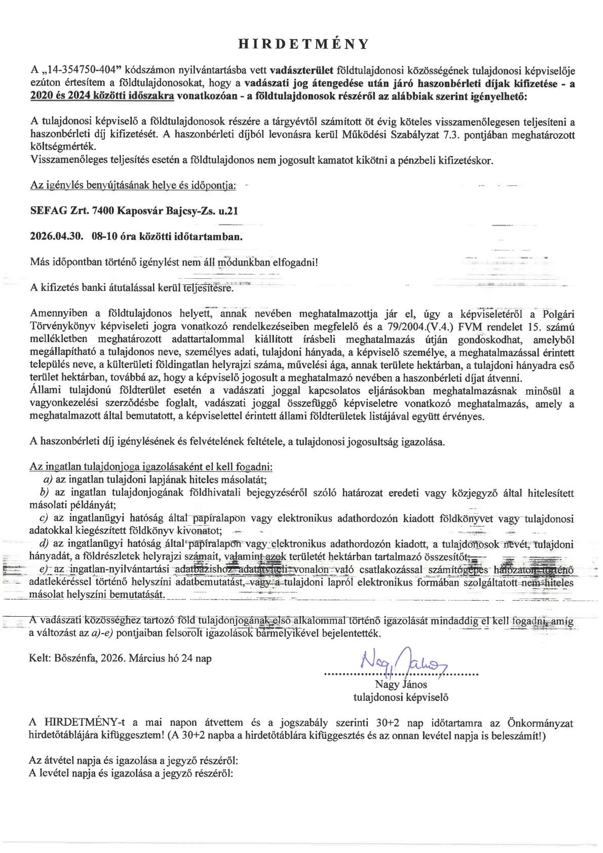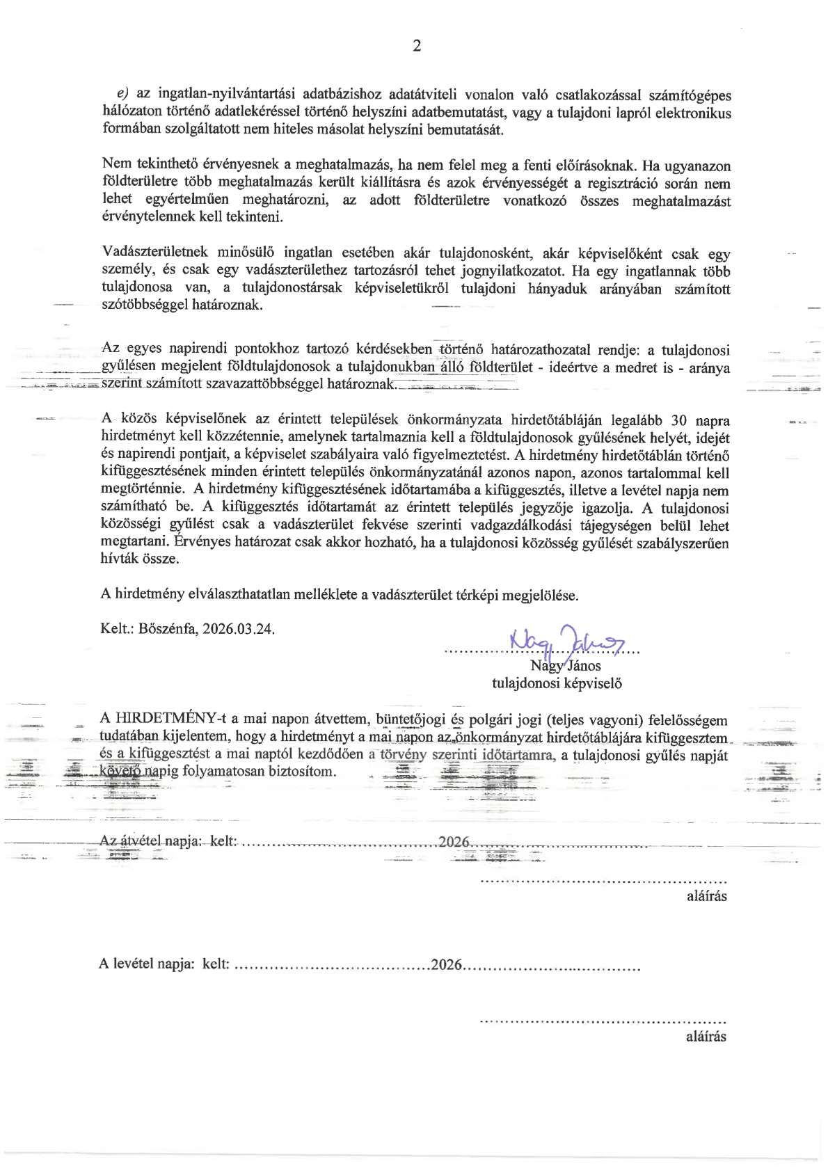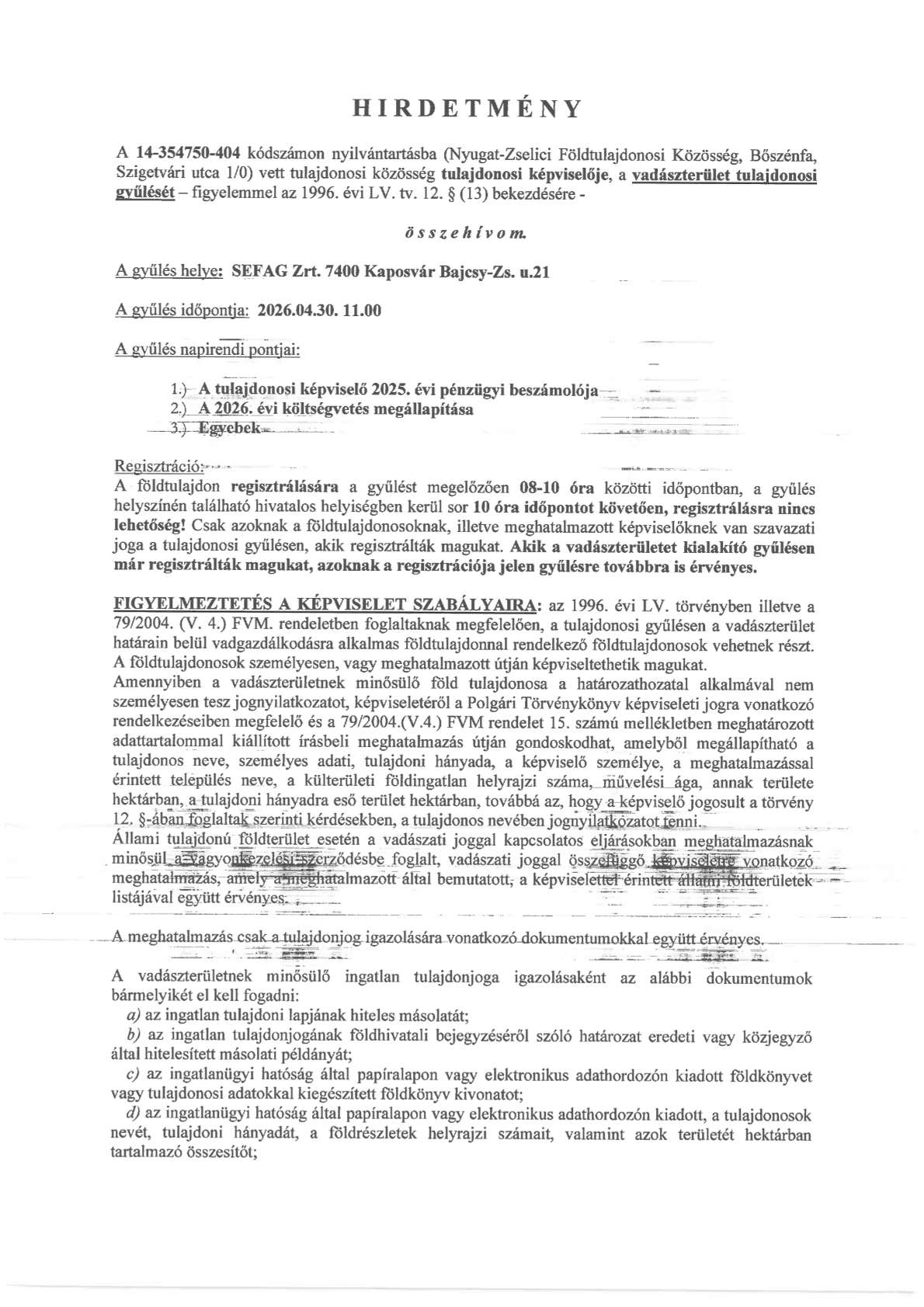 • Vadászterület tulajdonosi gyűlés 2026.04.30